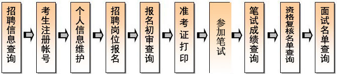 1)登录招聘报名系统。 2)通过首页左栏“报名导航”下的"招聘岗位查询",查询相关招聘岗位。 3)通过首页用户登录窗口下的“注册”功能,取得考生个人帐号和密码。 4)以个人帐号登录系统后,通过"个人信息维护"功能,补充、修改、完善个人报考信息。 5)通过“招聘岗位报名”功能,选报招聘岗位。 6)资格审核通过的考生,应按时通过"准考证打印"功能打印本人准考证,参加考试。 7)通过"笔试成绩查询"功能,查询笔试成绩。